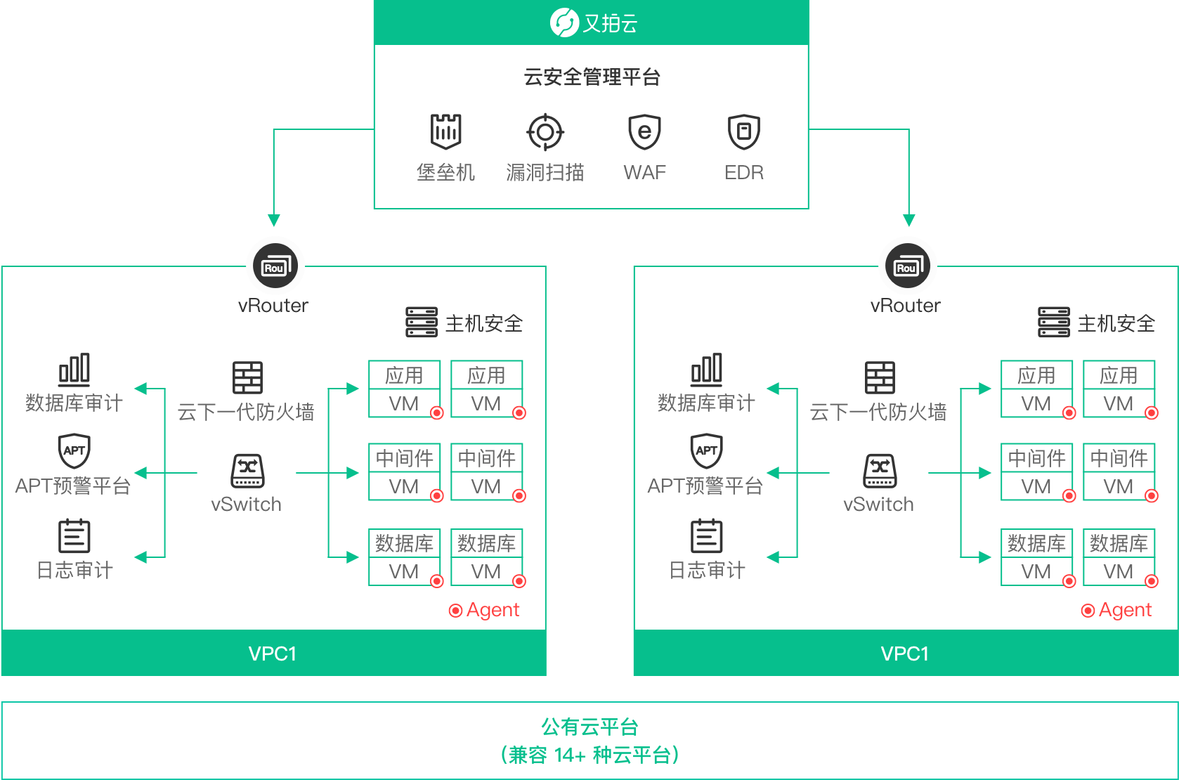 19+ 云安全能力,兼容 14+ 种云平台,一键满足业务等保合规需求。